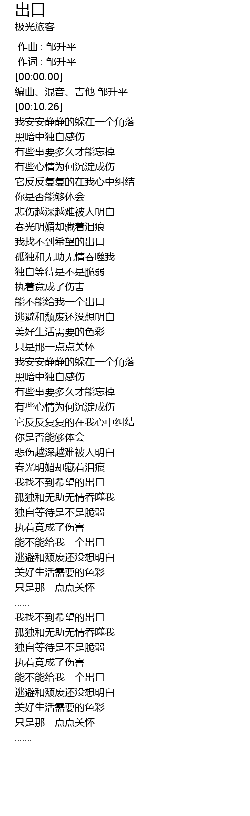 | [00:04.22] | 编曲、混音、吉他 邹升平 |