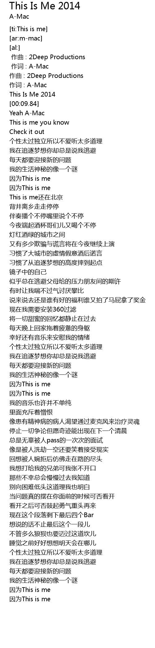 | [00:06.82] | This Is Me 2014 |