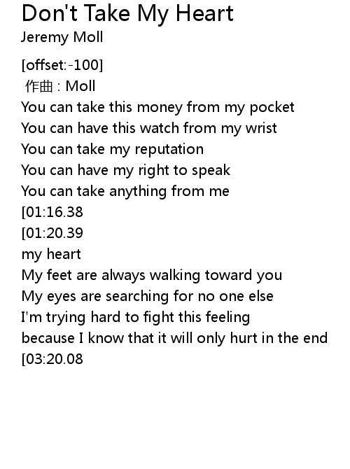 | [01:12.09][01:20.39][02:26.67][02:34.78][03:40.66][03:48.89][03:57.67] | don' t take my heart |