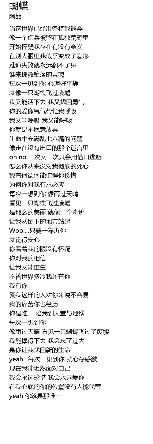 | [03:15.360] | 像雨过天晴 看见一只蝴蝶飞过了废墟 |