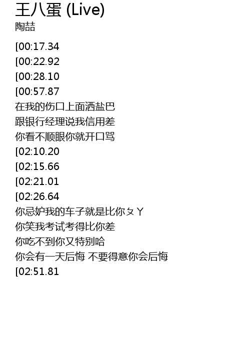| [03:13.62][00:28.10] | 你这个没有心的王八蛋 |