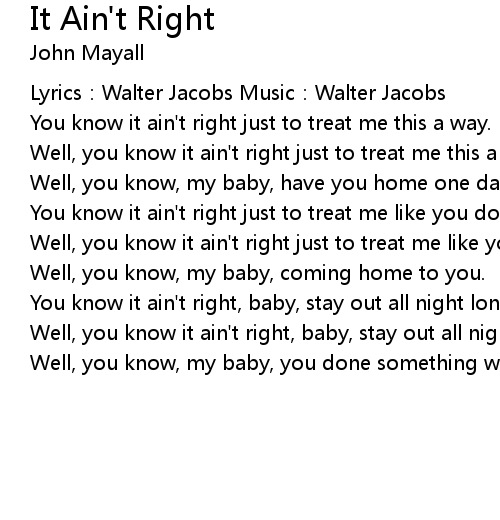 | Well, you know it ain' t right, baby, stay out all night long. | |