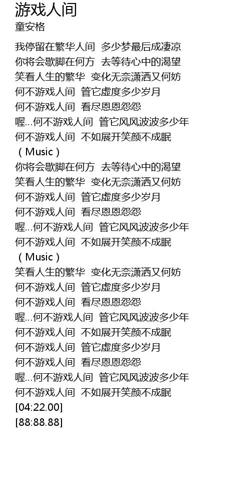 | [04:13.00] | 何不游戏人间 不如展开笑颜不成眠 |