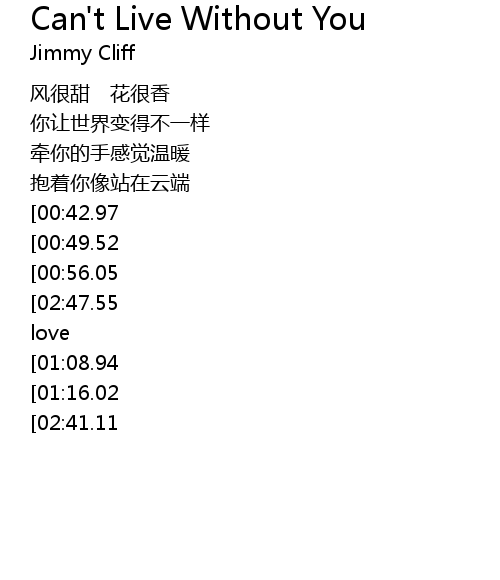 | [03:01.13][02:47.55][02:21.38][01:28.75][01:02.25] | oh i can't live without your love |