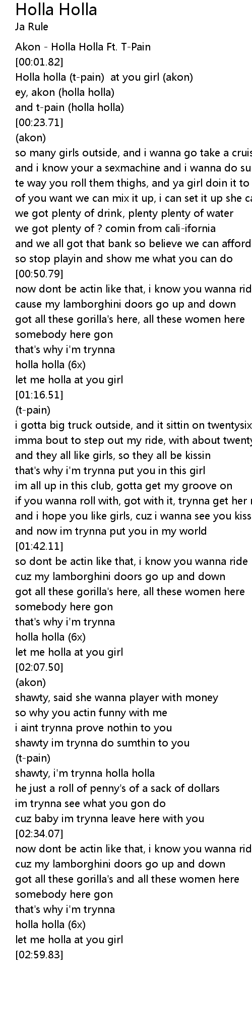 | [00:03.13] | Holla holla (t-pain) at you girl (akon) |