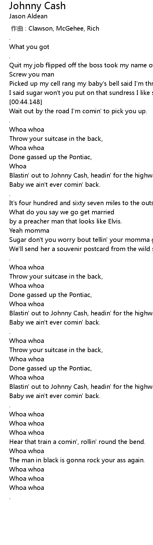 | [01:53.598] | Blastin' out to Johnny Cash, headin' for the highway, |