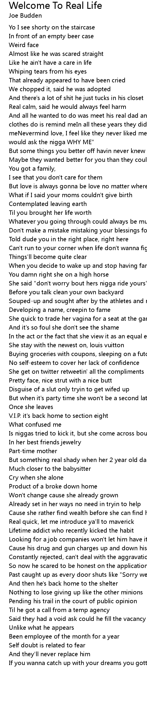 And all he wanted to do was meet his real dad and real mom"All the nice home and clothes do is remind meIn all these years they didn't even try to find meNevermind love, I feel like they never liked meIf I thought there was a god I would ask the nigga WHY ME" |
