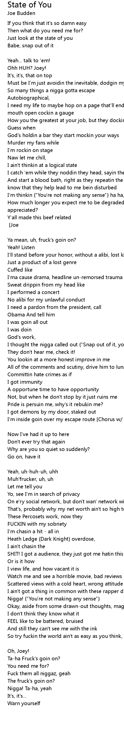 So try fuckin the world ain't as easy as you think, nigga! [Chorus + Interlude] [Outro: Joe Budden]