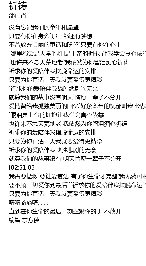 | [00:51.59] | `也许来不急天荒地老`我依然为你留泪痴心祈祷 |