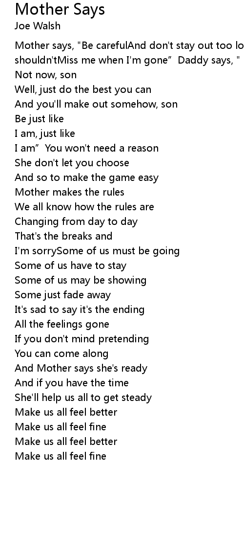 | Mother says, " Be carefulAnd don' t stay out too longDon' t do things you shouldn' tMiss me when I' m gone" Daddy says, " | |