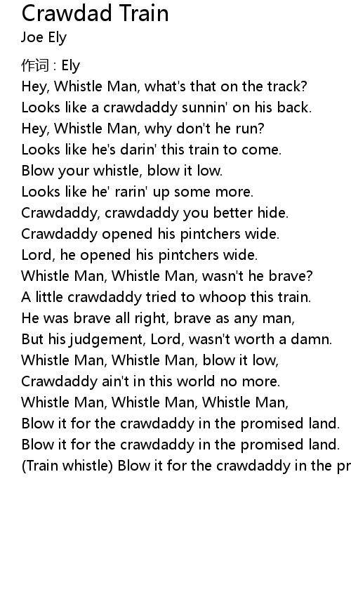 | Train whistle Blow it for the crawdaddy in the promised land. |