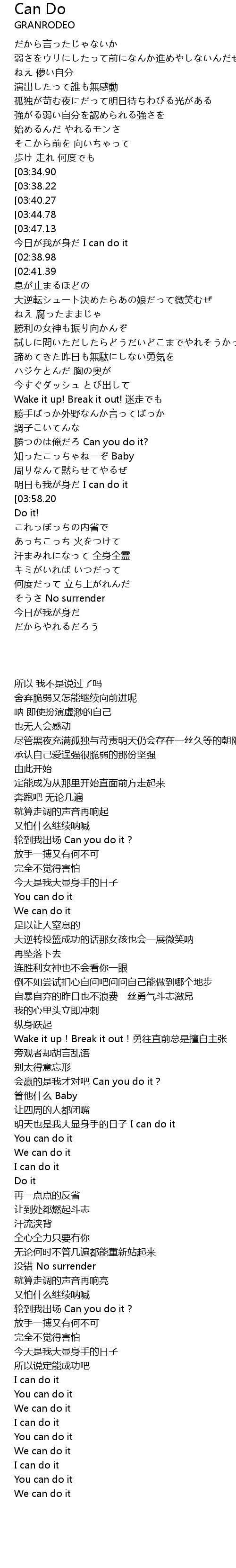 | [02:43.76][03:58.20][04:05.28][04:12.57] | I can do it |
