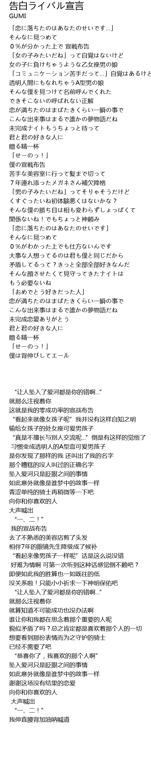 | [00:06.49] | 0%が分かった上で 宣戦布告 |