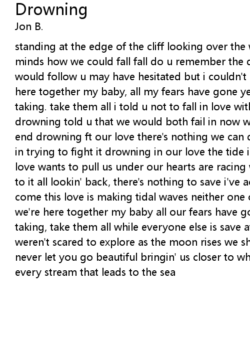 standing at the edge of the cliff looking over the water there it crossed our minds how we could fall fall do u remember the day u decided to jump and trust i would follow u may have hesitated but i couldn't let u fall alone long as were here together my baby, all my fears have gone yeah if every moments breath taking. take them all i told u not to fall in love with me, but u did now we're drowning told u that we would both fail in now we're both swimming in the deep end drowning ft our love there's nothing we can d0 it happened there's no point in trying to fight it drowning in our love the tide is gettng stronger now ano love wants to pull us under our hearts are racing with the waves let's surrender to it all lookin' back, there's nothing to save i've accepted all that is to come this love is making tidal waves neither one of us can run from long as we're here together my baby all our fears have gone away if every moments breath taking, take them all while everyone else is save at shore afraid of what we weren't scared to explore as the moon rises we shift with the tides and i'll never let you go beautiful bringin' us closer to where we could be beautiful every stream that leads to the sea |