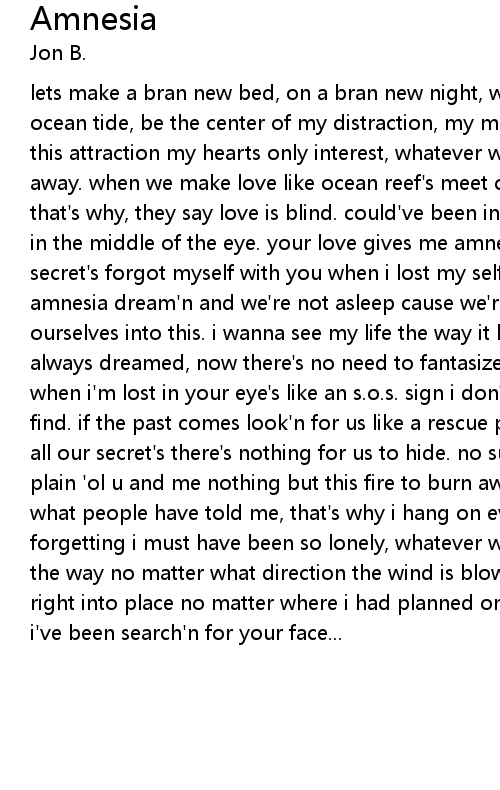 lets make a bran new bed, on a bran new night, when the dry sand is wet by the ocean tide, be the center of my distraction, my mind can't resist, blinded by this attraction my hearts only interest, whatever was before now seems to fade away. when we make love like ocean reef's meet crashing waves, have to guess that's why, they say love is blind. could've been in a hurricane. could've been in the middle of the eye. your love gives me amnesia, from all our memories secret's forgot myself with you when i lost my self into this your love gives me amnesia dream'n and we're not asleep cause we're one, no longer two when we lose ourselves into this. i wanna see my life the way it looks in your mind. how i've always dreamed, now there's no need to fantasize like a shipwreck on a beach, when i'm lost in your eye's like an s.o.s. sign i don't want anyone but u to find. if the past comes look'n for us like a rescue plane in sight. spotlight on all our secret's there's nothing for us to hide. no survival kit for us, just plain 'ol u and me nothing but this fire to burn away memory i keep forgetting what people have told me, that's why i hang on every word u say, i keep forgetting i must have been so lonely, whatever was distracting no longer's in the way no matter what direction the wind is blowing some how it all just fits right into place no matter where i had planned on going, i've alwavs known that i've been search'n for your face... |