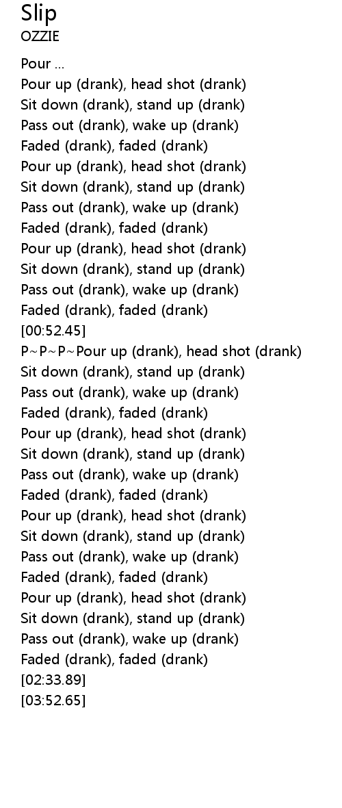 | [01:55.20] | Pour up (drank), head shot (drank) |