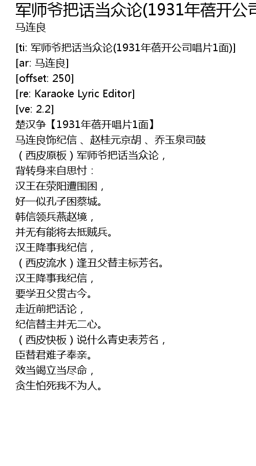 | [00:00.00] | 楚汉争【1931年蓓开唱片1面】 |