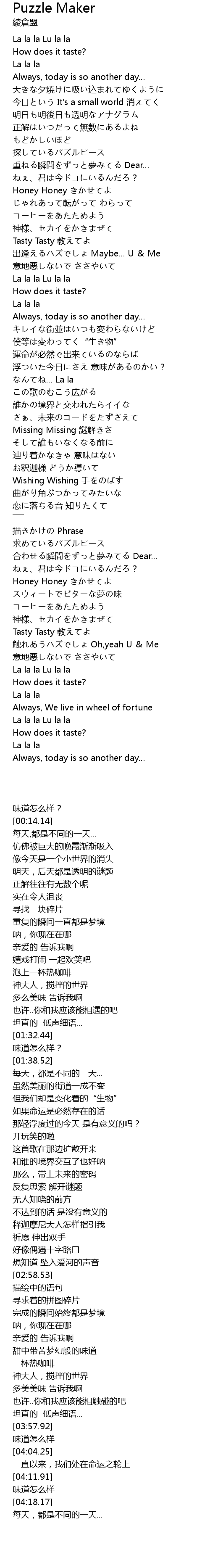 | [01:17.71] | 神様、セカイをかきまぜて |