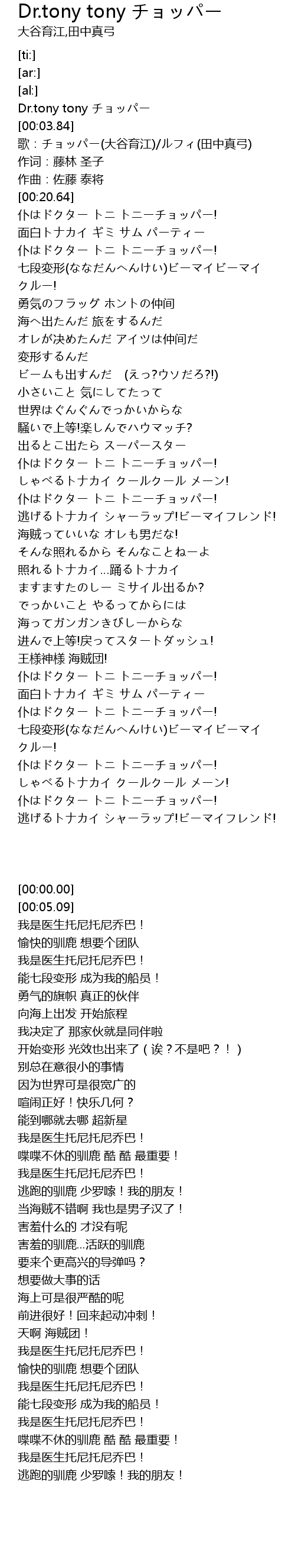 | [00:05.09] | 歌:チョッパー(大谷育江)/ルフィ(田中真弓) |