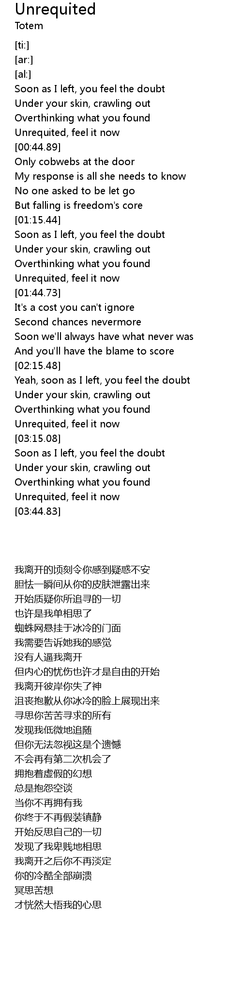 | [01:41.00] | Unrequited, feel it now |