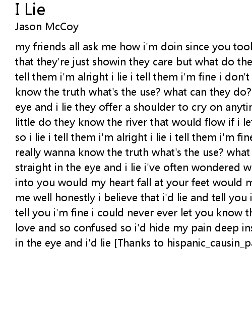 my friends all ask me how i'm doin since you took you sweet love away and i kno that they're just showin they care but what do they expect me to say so i lie i tell them i'm alright i lie i tell them i'm fine i don't think they really wanna know the truth what's the use? what can they do? so i look them straight in the eye and i lie they offer a shoulder to cry on anytime, i just have to call but little do they know the river that would flow if i let the first tear drops fall so i lie i tell them i'm alright i lie i tell them i'm fine i don't think they really wanna know the truth what's the use? what can they do? so i look them straight in the eye and i lie i've often wondered what i'd do if i were to run into you would my heart fall at your feet would my foolish pride get the best of me well honestly i believe that i'd lie and tell you i'm alright i'd lie i'd tell you i'm fine i could never ever let you know the truth that i'm still in love and so confused so i'd hide my pain deep inside then i'd look you straight in the eye and i'd lie [Thanks to [email protected] for lyrics] |