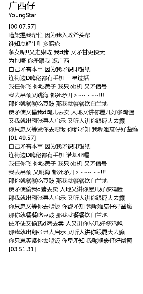 | [00:43.65] | 为乜嘢 你矛跟我 返广西 |