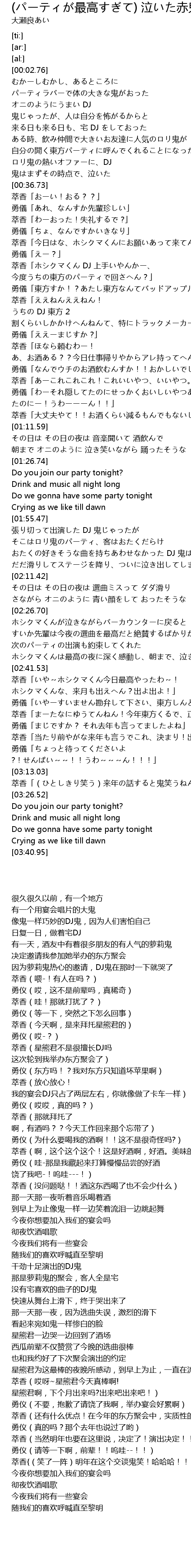 | [00:28.98] | ロリ鬼の熱いオファーに、DJ 鬼はまずその時点で、泣いた |