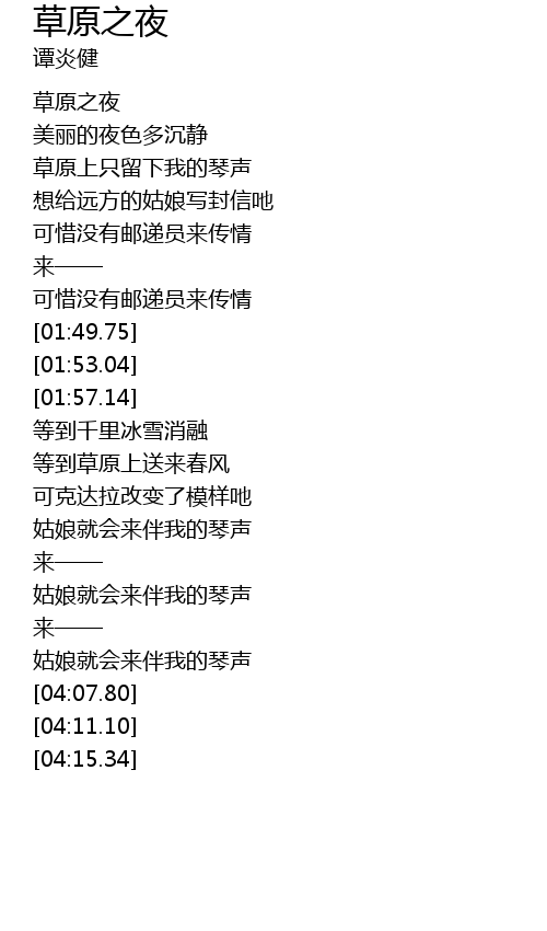 | [00:34.31] | cǎo yuán shàng zhǐ liú xià wǒ de qín shēng |