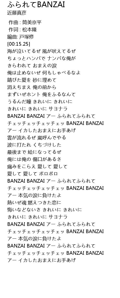 | [02:01.10] | BANZAI BANZAI アー ふられてふられて |