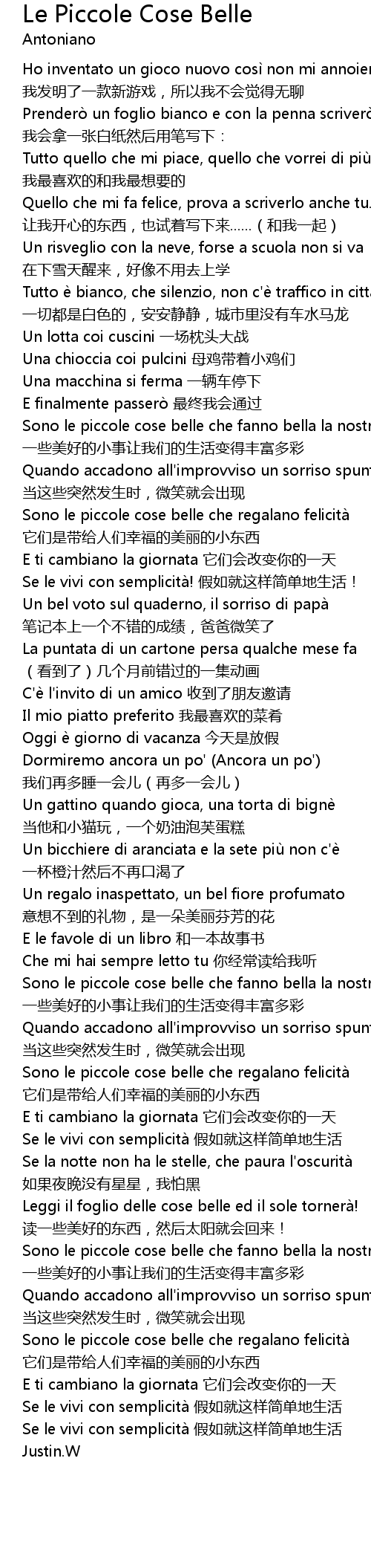 | [02:43.20] | Sono le piccole cose belle che fanno bella la nostra vita 一些美好的小事让我们的生活变得丰富多彩 |