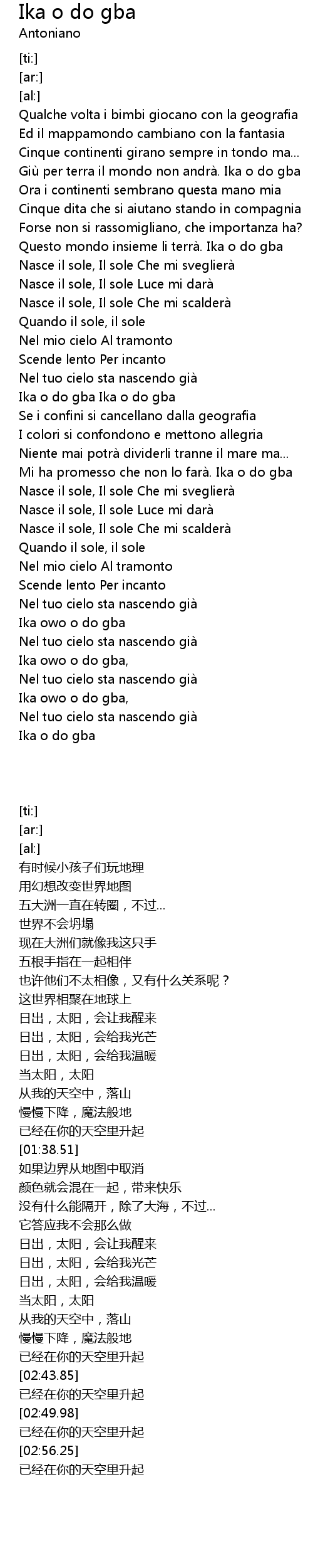| [00:32.85] | Giù per terra il mondo non andrà. Ika o do gba |