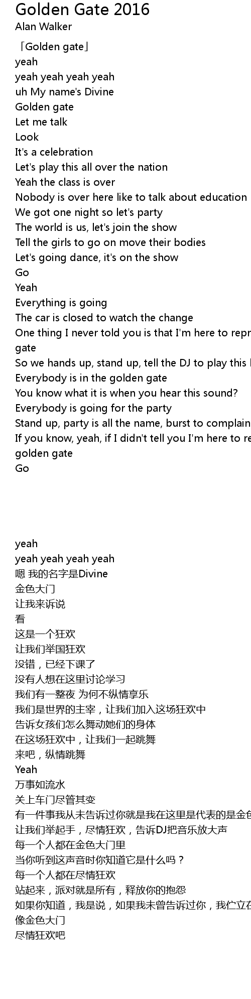 | [01:19.67] | One thing I never told you is that I' m here to represent the golden gate |