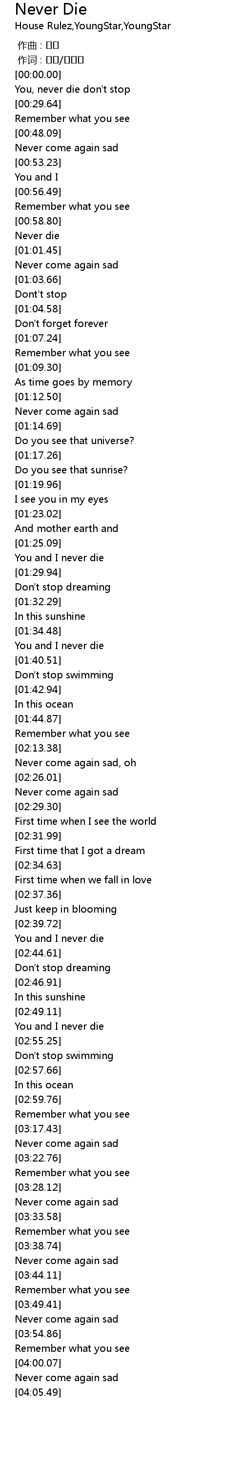 | [00:21.54] | You, never die don't stop |