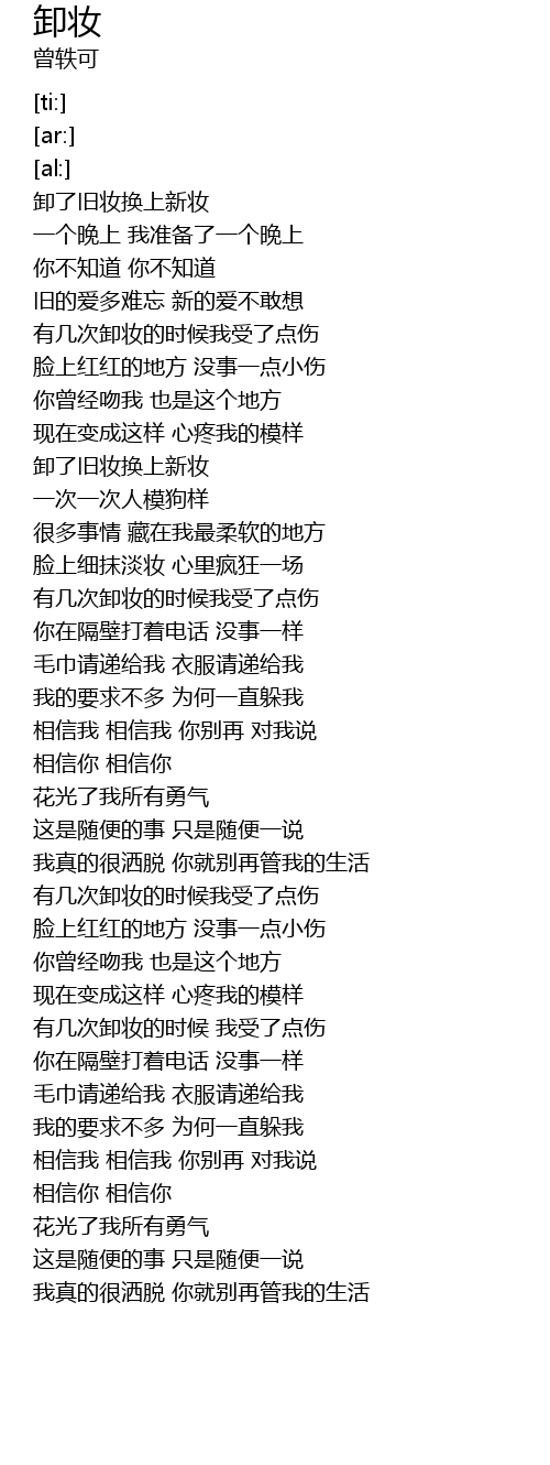 | [01:20.48] | 有几次卸妆的时候我受了点伤 |
