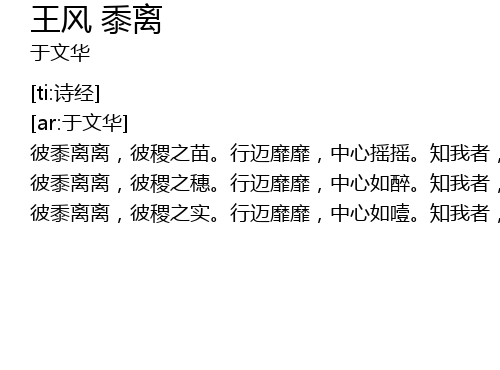 | [02:10.381] | 彼黍离离,彼稷之实。行迈靡靡,中心如噎。知我者,谓我心忧;不知我者,谓我何求。悠悠苍天,此何人哉?此何人哉?知我者,谓我心忧;不知我者,谓我何求。悠悠苍天,此何人哉?此何人哉? |