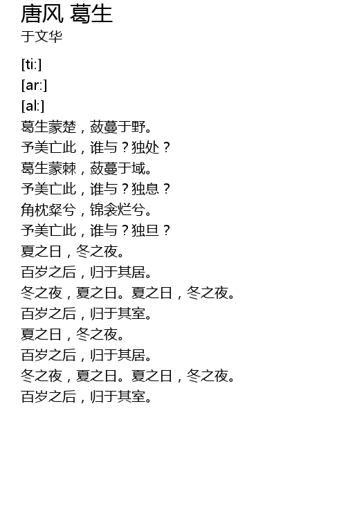 | [01:13.91] | 葛生蒙棘,蔹蔓于域。 |