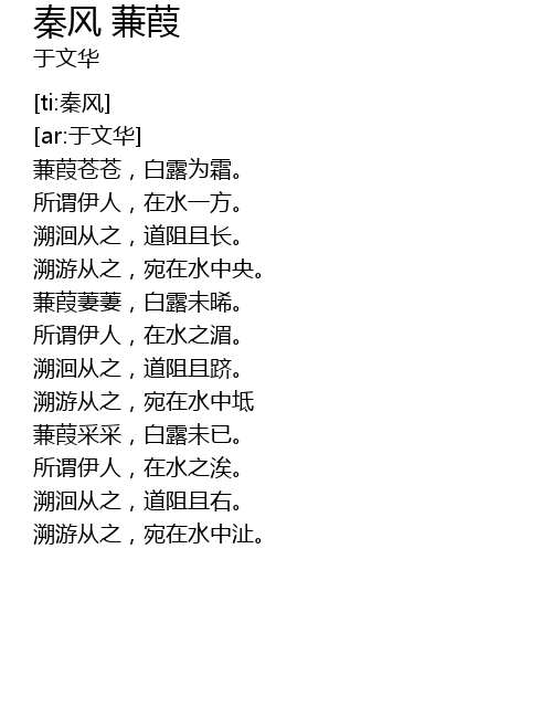| [03:29.373] | 蒹葭采采,白露未已。 |