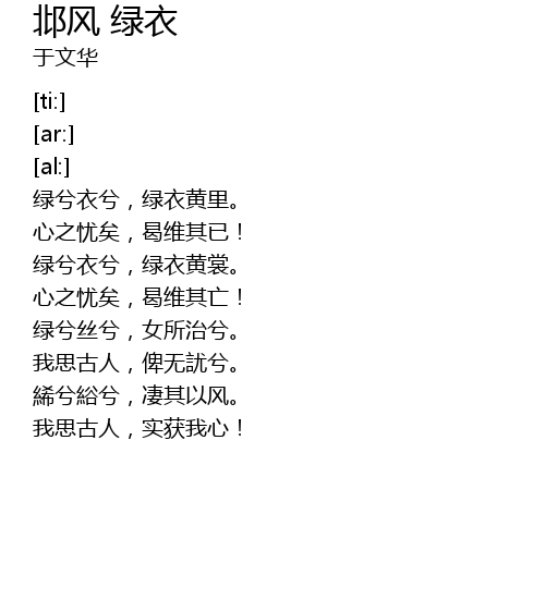 | [01:39.77] | 绿兮衣兮,绿衣黄裳。 |