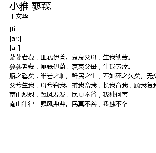 | [01:11.75] | 蓼蓼者莪,匪莪伊蔚。哀哀父母,生我劳瘁。 |