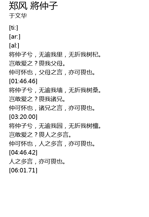 | [03:55.33] | 将仲子兮,无逾我园,无折我树檀。 |