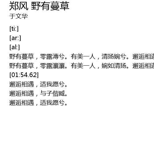 | [00:32.32] | 野有蔓草,零露漙兮。有美一人,清扬婉兮。邂逅相遇,适我愿兮。 |