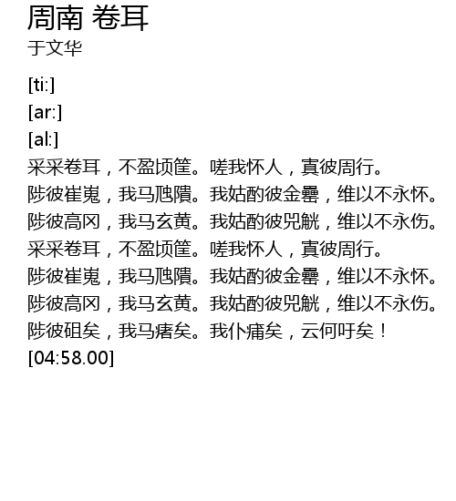 | [00:52.36] | 采采卷耳,不盈顷筐。嗟我怀人,寘彼周行。 |