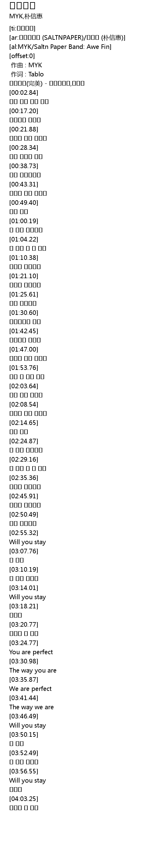 | [00:00.40] | 완벽해요(完美) - 솔튼페이퍼,박신혜 |