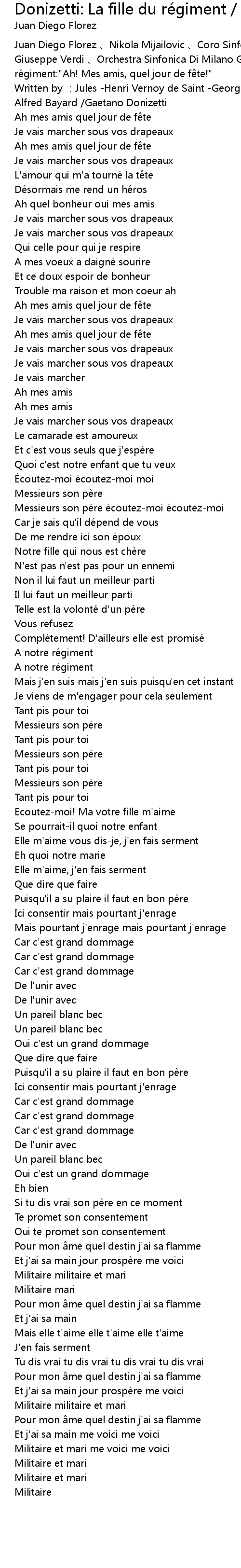 | [00:00.317] | Juan Diego Florez Nikola Mijailovic Coro Sinfonico Di Milano Giuseppe Verdi Orchestra Sinfonica Di Milano Giuseppe Verdi La fille du ré giment:" Ah! Mes amis, quel jour de f te!" |