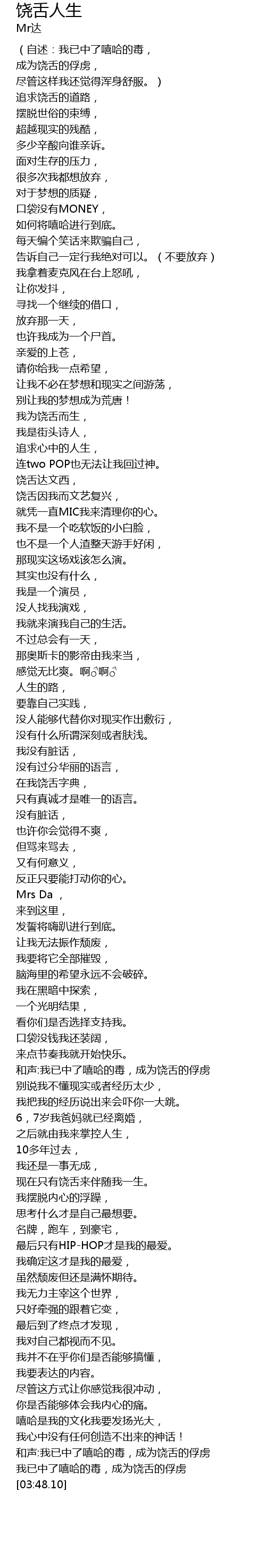 | [02:53.35] | 现在只有饶舌来伴随我一生。 |
