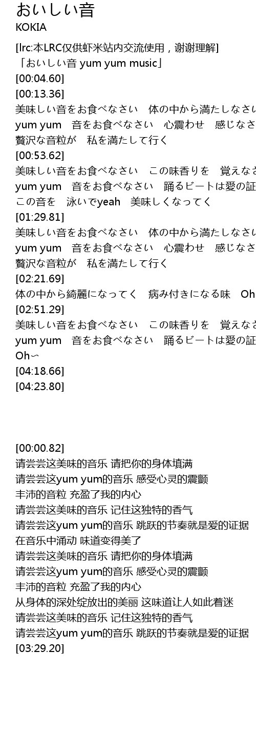| [00:00.82] | 「おいしい音 yum yum music」 |