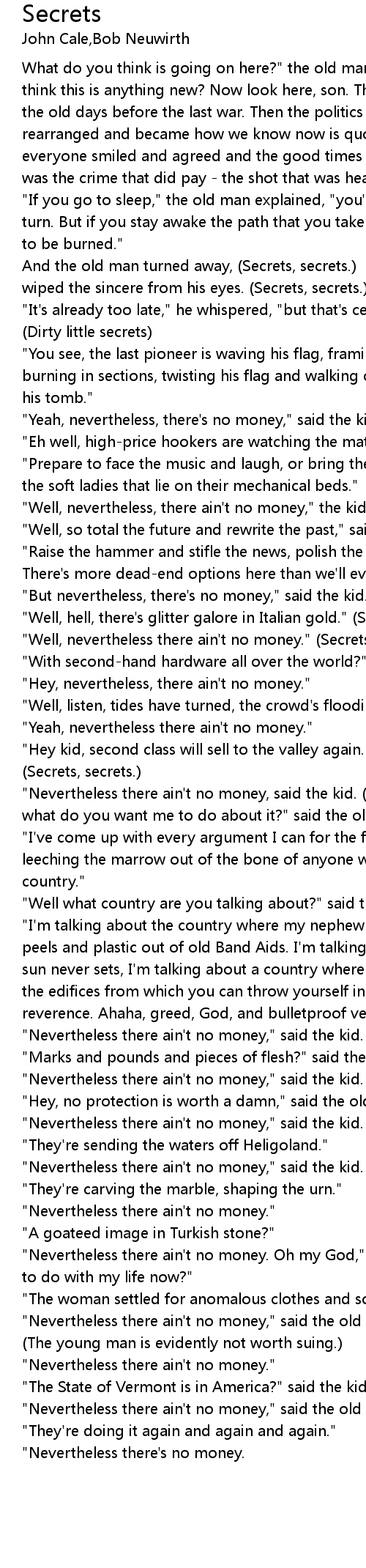 "Nevertheless there ain't no money, said the kid. (Secrets, secrets.) "Well, what do you want me to do about it?" said the old man. (Dirty little secrets.) |
