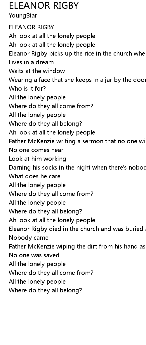 Eleanor Rigby picks up the rice in the church where a wedding has been |