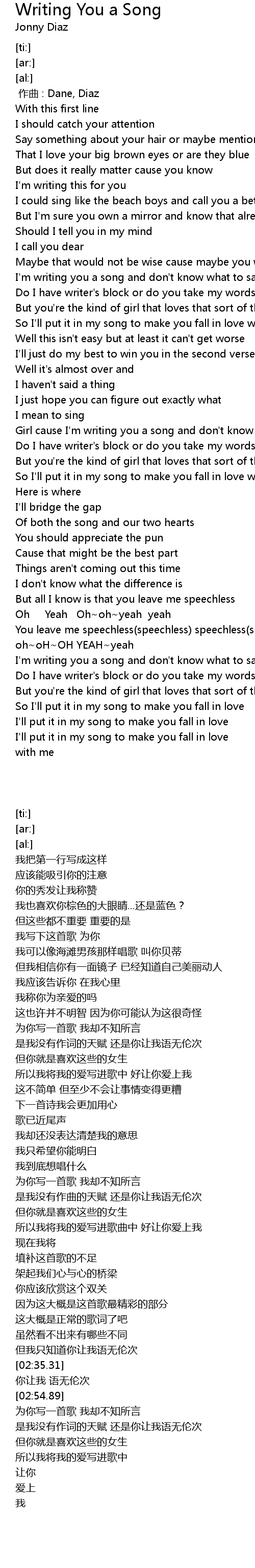 | [01:44.57] | Girl cause I'm writing you a song and don't know what to say |