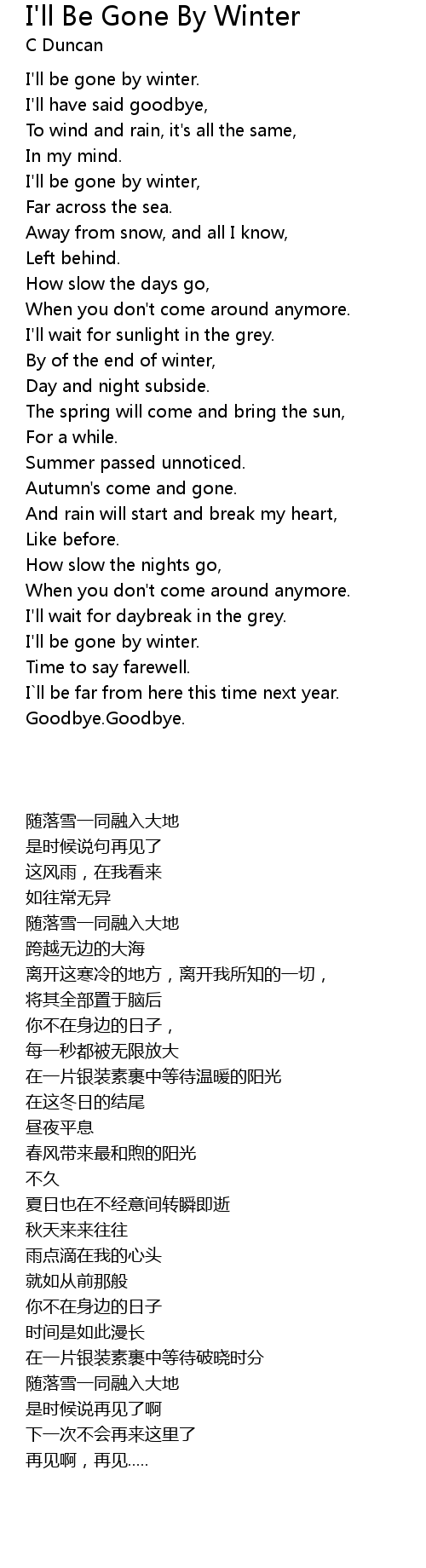| [00:15.65] | I'll be gone by winter. |